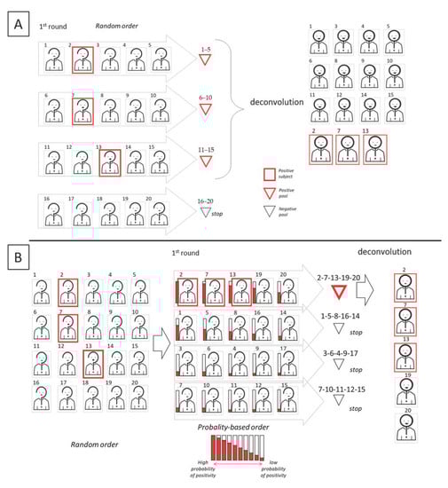 Graphic representation of the informed sequential pooling approach. In this example, the cohort dimension is 20, the pool size is 5. Upper (A) and lower (B) panels show two possible scenarios based on available information allowing for the classification of subjects as either “suspect positive” or “suspect negative.” In scenario B, information allows for a concentration of all the positive subjects in the same pool and so improve the efficiency of the pooling scheme.