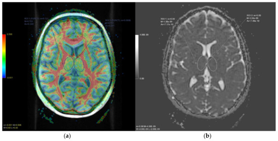 In (a), axial diffusion tensor imaging (DTI) slice at thalamic level. The color-coded map represents fractional anisotropy (FA) values (higher FA values in red, depicting white matter tracts, lower FA values in blue). In (b), axial apparent diffusion coefficient (ADC) map slice at the same level. Oval regions of interests (ROI) and delineated on both thalami to obtain quantitative FA and ADC values, respectively.