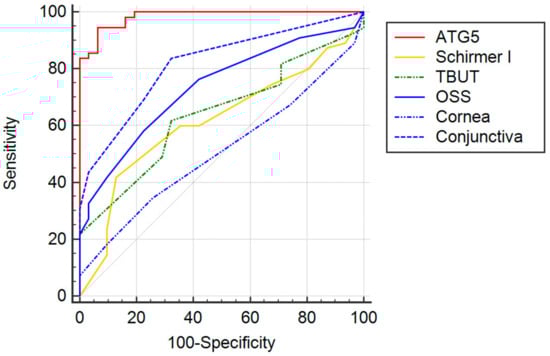 The Schirmer I test and ocular surface staining (OSS) are currently used as ocular tests for diagnosing SS along with serologic tests and oral tests [12,13]. Due to the high variability and measurement error of these tests, however, researchers have been trying to develop more specific ocular biomarkers or tests for SS [14,15,16,17]. For this reason, we evaluated the diagnostic performance of tear autophagy related 5 (ATG5) for discriminating SS DE and compared it with other dry eye parameters included in diagnostic criteria of SS (Schirmer I and OSS).