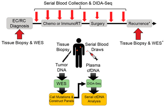 In this feasibility study, human specimens and data (including blood, tumor tissue, and clinical information) were prospectively acquired from participants with locally-advanced esophageal (n = 3) or rectal cancer (n = 2) undergoing definitive multimodal therapy after their informed written consent (Oregon Health & Science University Institutional Review Board Study #10163, first approved 19 October 2017). Plasma samples were collected at baseline, throughout therapy and surveillance. Biopsy tissue was collected at diagnosis and recurrence (Figure 1). Blood draws were serially collected and fractionated for cfDNA isolation using the “double spin” method (≤40 mL, a range of 6–40 mL, in 5 × 6 mL or 4 × 10 mL, purple-capped EDTA tubes) [8,11]. DNA was extracted from FFPE, plasma, and buffy coat using commercially available kits (see below). Within 6 h of collection, blood plasma was isolated by first spinning whole blood at 1000 g for 10 min, separating the top plasma layer into 1-mL aliquots, then spinning those aliquots at 15,000 g for 10 min, transferring the supernatant to cryovials, and storing at −80 °C. Fixed formalin paraffin-embedded biopsies and tumor-tissue were collected, and DNA extraction was carried out using QIAgen FFPE DNA extraction kit (QIAGEN, Redwood City, CA, USA). DNA was extracted from plasma and buffy coat using Macherey-Nagel NucleoSnap (Macherey-Nagel GmbH & Co., Duren, Germany) and QIAgen Blood and Tissue kits, respectively. All DNA extractions were quantified using the Qubit 3 fluorometric quantification system (ThermoFisher Scientific, Waltham, MA, USA) and size distribution was checked with a BioAnalyzer 2100 (Agilent Technologies, Santa Clara, CA, USA). DNA isolated from FFPE samples and buffy coat were fragmented by sonication to 150 bp using a Covaris E220 (Covaris Inc., Woburn, MA, USA) prior to library preparation (cfDNA was not fragmented prior to ligation).