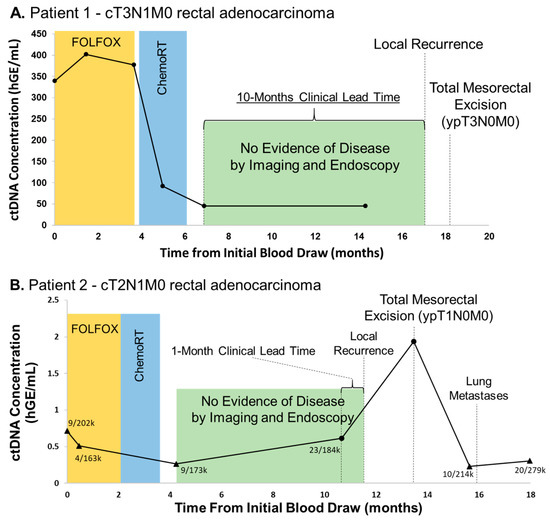 As non-operative management (NOM) of locally-advanced esophageal and rectal cancer following chemotherapy and radiation therapy is more widely adopted [1,2], a sensitive and specific biomarker of sub-clinical tumor burden has the potential of further assisting in the assessment of patients best suited for an upfront non-operative approach or for detecting early sub-clinical recurrences in patients in need of salvage surgery in the surveillance period [3]. Circulating tumor DNA (ctDNA) has been extensively investigated for its diagnostic and prognostic utility as such a biomarker [4,5,6,7,8], however, the longitudinal application of ctDNA monitoring throughout multi-modality therapy (systemic therapy, radiotherapy, and/or surgery) has been less extensively studied [4]. Undetectable ctDNA following definitive treatment has been shown to be associated with pathologic complete response (pCR) and improved outcomes, particularly in the neoadjuvant setting for breast cancer [9,10]; however, the feasibility of serial ctDNA measurements in the neoadjuvant setting for rectal and esophageal cancer has not been previously reported.