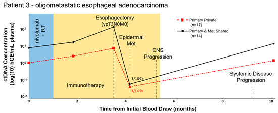 Oligometastatic esophageal adenocarcinoma cancer patient with primary-only oligoprogression had elevated ctDNA levels associated with systemic disease progression. In Patient 3, whole-exome sequencing of both the primary tissue biopsy and a subsequent metastatic dermal lesion revealed a high mutation burden and 45% overlap in mutation profiles. Serial ctDNA levels were retrospectively analyzed using DIDA-Seq and using patient-specific capture panels. Aggregate variant allele frequency (VAF) was converted to human genome equivalents per ml (hGE/mL) of plasma and plotted in log10-scale over treatment course. Plot shows ctDNA monitoring using mutations either private to the primary tissue biopsy (n = 17, solid black line) or shared between the primary tissue biopsy and the biopsy of the metastatic dermal lesion (n = 14, dashed red line). Statistical significance, as compared to a negative control, was determined at each time point. CtDNA values not significantly different from negative controls are indicated (triangle) and aggregate mutant reads/total reads are reported. Statistical significance was determined prior to converting aggregate VAF to hGE/mL plasma.