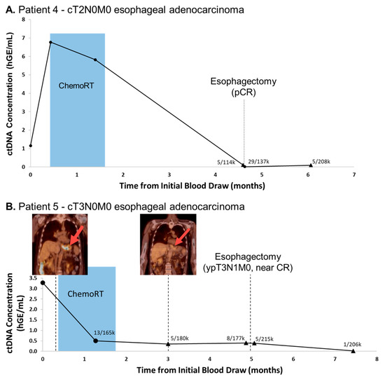 Patient 5 is a 69 year old male with cT3N0M0 distal esophageal adenocarcinoma who received neoadjuvant chemoradiation prior to esophagectomy with surgical pathology confirming a near-complete response. WES found 135 non-synonymous mutations and 41 genomic site were included in the ctDNA panel. As with Patient 4, ctDNA levels in this patient were elevated prior to treatment, but quickly fell below the limit of detection during chemoradiation with concurrent reduced tumor size and avidity on PET-CT. CtDNA levels remained statistically insignificant at final follow-up 10 weeks following esophagectomy with no clinical evidence of disease at that time (Figure 4B). Eight months later, the patient was found to have a malignant pleural effusion; however plasma was unable to be collected to evaluate the recurrence of ctDNA.