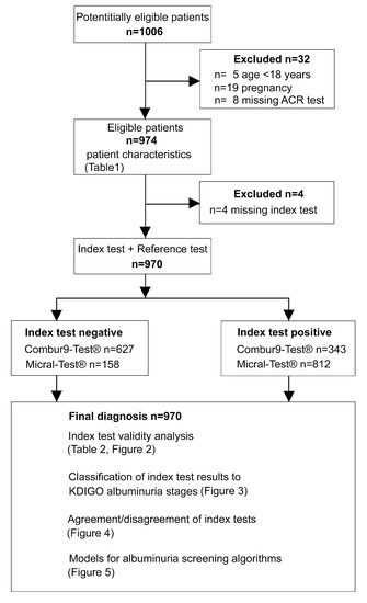 Overall, 1006 patients were recruited (Figure 1). Five patients aged less than 18 years, 19 pregnant women, and eight patients with a missing ACR test were excluded, leaving 974 patients for the final analysis. In an additional four patients, Combur9-Test® and/or Micral-Test® results were missing, and therefore were not included in the comparison between the semiquantitative dipstick tests and the ACR test, leaving n = 970 for the assessment of the test validity, the distribution within albuminuria stages, and the semiquantitative dipstick test utility analysis for albuminuria screening algorithms.