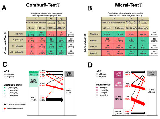 Distribution within KDIGO albuminuria classification: albuminuria stages A1: normally to mildly increased (<10–29 mg/g), A2: moderately increased (30–299 mg/g), A3: severely increased (≥300 mg/g); green areas: true-negative and true-positive classifications; red areas: false-positive and false-negative classifications; (A) total disagreement (red areas) and agreement (green areas) between index test (Combur9-Test®) and ACR test in n = 262 (27%) and n = 708 (73%), respectively; (B) total disagreement (red areas) and agreement (green areas) between index test (Micral-Test®) and ACR test in n = 709 (73%) and n = 261 (27%), respectively. (C,D): agreement/disagreement of (C) Combur9-Test® and (D) Micral-Test® with ACR at a cut-off of 30 mg/g: black arrow: agreement; red arrow: disagreement; arrow widths are proportional to the percentage of agreement/disagreement; KDIGO: Kidney Disease Improving Global Outcome [13]; ACR: albumin-to-creatinine ratio.