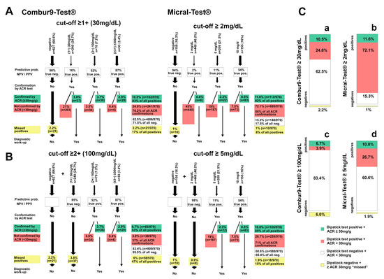 In scenario B, for Micral-Test® positivity, the cut-off was set at ≥5 mg/dL. A negative test had an NPV of 98% and included 62.4% (n = 606/970) of the screened population. Without further confirmation of a negative test result, 1.9% (n = 18/970) and 15% (18/123) of cases with a relevant albuminuria of the whole population and of all albuminuria-positives would be missed, respectively. Correctly ruled out would be 60.6% (n = 588/970) of the population and 69.4% (n = 588/847) of all albuminuria-negatives, respectively. Of the 37.5% (n = 364/970) with a positive dipstick Micral-Test® and a subsequent ACR conformation test, 10.8% (105/970) of the population and 85% (n = 105/123) of all albuminuria-positives would be confirmed, and 26.7% (n = 259/970) of the population and 71% (n = 259/812) of all Micral-Test® positives would be over tested, respectively. In summary, the proposed algorithm would mean that 15% of the true positive results would be missed (i.e., 1.9% of the whole population) and that an unnecessary additional test would have to be carried out in 71% of the patients with a positive screening dipstick test (i.e., in 26.7% of the whole population) (Figure 5A).