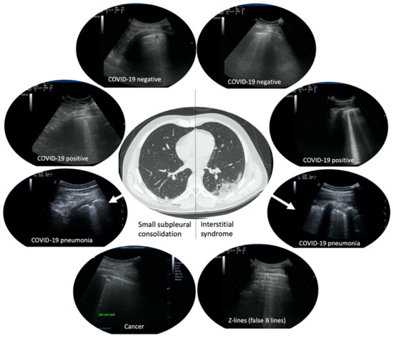 Examples of small subpleural consolidations and group of B-lines more than three per field of scan. In the center, a computer tomography scan of a real COVID-19 patient presenting a small subpleural consolidation in the right lung (left of the image) and a ground-glass area in the left lung (right of the image), and their corresponding features in lung ultrasound (LU) (arrows). On the left, small subpleural consolidations in four different patients with different diagnoses. On the right, group of B-lines more than three per field of scan in four different patients with different diagnoses.