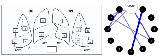 A correlation network analysis was performed in order to visually estimate the relationship between specific lung areas and COVID-19 positivity. LU alterations mostly correlated to COVID-19 positivity were detected in right and left upper-posterior and lower-lateral lung areas (Figure 1 and Table 3).