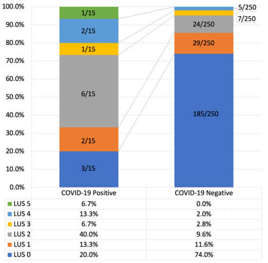 In the COVID-19 negative group, 74% of the subjects (185/250) presented a normal lung ultrasound appearance (LUS = 0), but 26% (65/250) showed some abnormalities. However, the vast majority (81.5%, 53/65 subjects) suffered only mild abnormalities: total lung ultrasound score either 1 or 2 was present respectively in in 29 and 24 subjects and none had LUS ≥ 5 (Figure 3).