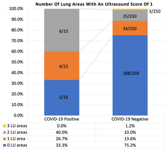 The number of affected areas was significantly greater in the 12/15 (80%) COVID-19 positive subjects showing LU abnormalities. In particular, 10/15 of all COVID-19 positive subjects showed abnormalities in ≥2 lung areas (67.7% vs. 12.8% in COVID-19 negative subjects). Abnormalities limited to one lung area were seen in only 16.7% (2/12) of COVID-19 positive subjects (vs. 50.7% in COVID-19 negative subjects).