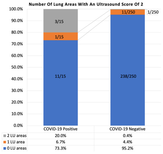 Number of lung areas interested by lung alteration 2 (LUA 2) in COVID-19 positive and negative group. LU = lung ultrasound.