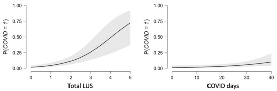 Logarithmic relationship between total LUS and COVID-19 positivity, and days worked in a COVID-19 ward (COVID days) and COVID-19 positivity.; COVID 0 = negative, COVID 1 = positive.