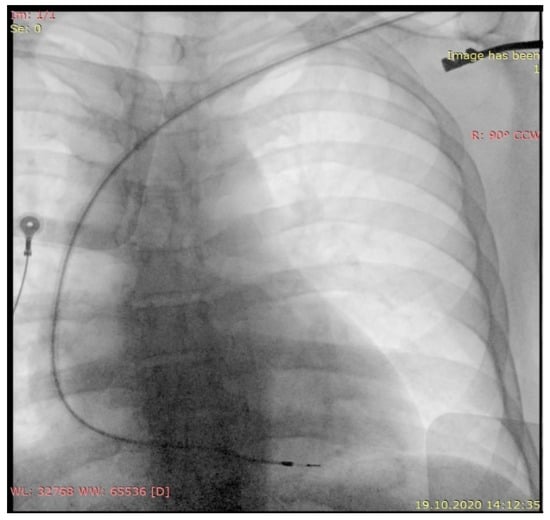 After an increase in the hemoglobin value to 8.6 g/dl (with red blood cell transfusions), according to the current practice indications, we decided to remove the entire pacing system along with the vegetation. We used the superior venous approach since the lead was accessible via the implanted cephalic vein. We unscrewed the lead connector, removed the pacemaker generator and freed the lead from the surrounding conjunctive tissue in the pocket, then cut the proximal end of the lead together with the connector. A straight stylet of 58 cm in length was inserted in the remaining lead and secured with non-absorbable sutures. Subsequently, we removed the fibrous tissue that encompassed the lead with the help of special extraction tools—mechanical sheaths (Byrd Dilator Sheath Sets, Extra Long, Outer Sheath ID/OD 13.1/15.2 French and 14.1/16.3 French, Cook Medical). The set of two telescoping dilator sheaths was advanced over the lead under fluoroscopic monitoring and carefully manipulated to disrupt the scar tissue and break the fibrous adhesions from the binding sites (the costoclavicular region, the right ventricle—from the tricuspid valve to the right ventricular apex); because the lead had not been freed by the time the sheaths neared the myocardium, the outer sheath was advanced to the myocardium. Using continuous firm traction, while the sheath countered the traction and supported the myocardial wall, we were able to remove the unbroken ventricular lead. Fluoroscopic images during the procedure can be seen in Figure 5 and Video 3 (Supplementary File). The extracted right ventricular lead with fibrous tissue at the distal end of the lead and a much larger vegetation (38/6 mm) found with echocardiography can be seen in Figure 6. The lack of correlation between the estimated and the real dimension of the vegetation comes from the atypical, very elongated form of the vegetation initially attached to the lead. Infective material along the lead course generally does not cause typical vegetations of measurable size, and both transthoracic and transesophageal echocardiography may be falsely negative, because of the pedunculated, low echogenicity vegetation that moves out of phase with the structure to which it is attached. Excised tissue from the vegetation was submitted for histopathological and microbiological evaluation. No microorganisms were detected, and the histopathological features were typical of sterile vegetation.