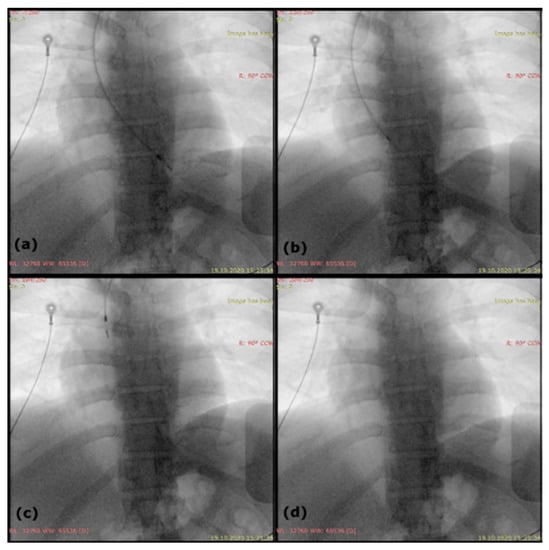 Antero-posterior fluoroscopic view of the lead extraction: (a) lead in the right ventricle; (b) lead in the right atrium; (c) lead in superior vena cava; (d) fluoroscopic view after lead extraction.