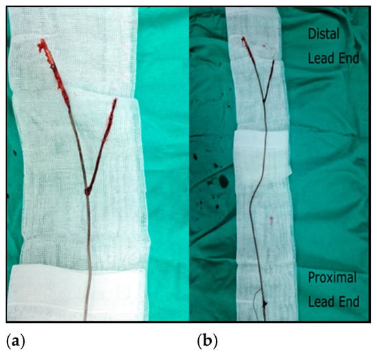 Extracted lead: (a,b) fibrotic capsule that encased the lead along the distal end and distal region of the lead and large pedunculate vegetation attached (approximately 38/6 mm).