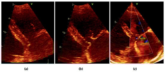 Transthoracic echocardiography, modified parasternal long axis–posterior leaflet of the tricuspid valve with chordal rupture, minor tricuspid regurgitation. (a,b) posterior leaflet of the tricuspid valve with chordal rupture; (c) minor tricuspid regurgitation.