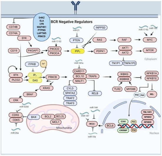 About 60% of alterations in both negative and positive regulators of NF-κβ were reported in cases of ABC-DLBCL while a lesser percentage were reported in cases of GCB-DLBCL [78]. These mutational changes inactivate certain genes, encoding for tumor-necrosis factor alpha-induced protein 3/A20 (TNFAlP3/A20), which are predominant in ABC-DLBCL [83]. TNFAlP3/A20 is associated with inactivation of NF-κβ, BCR and TLR responses. Moreover, TNFAlP3/A20 inactivates BCR response through its interaction with MALT1 [81]. Therefore, LoF of TNFAlP3/A20 could influence lymphomagenesis by inducing prolonged NF-κβ signaling. Approximately 9% of ABC-DLBCLs patients were shown to possess CARD11 mutations [84]. CARD11 is an essential component of CBM (CARD11/BCL10/MALT1) complex, which alongside TRAF6 is essential for the transduction of signaling from BCR to NF-κβ [84]. While an expected outcome of these genetic mutations initiates responses of NF-κβ signaling pathway similar signals could activate several additional downstream signaling cascades such as PI3K, and ERK/MAP kinase. In summary, BCR and NF-κβ pathways are disrupted by genetic mutations in both ABC-DLBCL and GCB-DLBCL.