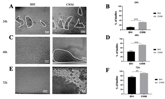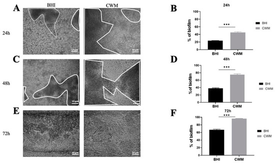 The S. aureus Newman strain formed a biofilm at each time point (Figure 2). Interestingly, at 24 h the percentage of constituted biofilms ranged from 22.0% ± 0.2 when the strain was cultivated in the BHI medium to 46.5% ± 0.4 in the CWM (p < 0.001) (Figure 2B). This significant difference was increased at 48 h post inoculation with 36.0% ± 0.2 of bacteria in the biofilm within the BHI medium vs. 77.2% ± 0.5 within the CWM (p < 0.001) (Figure 2D). Finally, after 72 h, the percentage of formed biofilm in CWM was almost complete (98.3% ± 0.1), whereas it was still incomplete in the BHI medium (63.1% ± 0.3) (p < 0.001) (Figure 2F). The significant difference in the biofilm formation of S. aureus in the CWM compared to the BHI medium are visualized in Figure 2A,C,E.