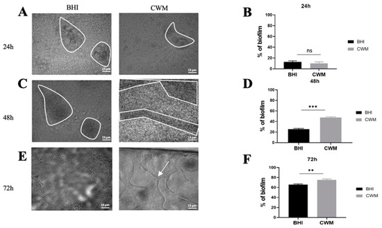 Kinetics of biofilm formation of Pseudomonas aeruginosa PAO1 in the BioFluxTM system. (A,C,E) correspond to representative images taken at different times ((A) 24 h; (C) 48 h and (E) 72 h) of biofilm formation in the CWM and BHI media. The images are the result of one of the three experimental triplicates. Biofilm is visualized by the black part in between the white lines. Percentages of biofilm formation are presented at 24 h (B), 48 h (D) and 72 h (F) postincubation in both media after three independent experiments. They were determined by the ImageJ software application. The white arrow indicates the presence of the exopolysaccharides structures formed by P. aeruginosa during biofilm formation. Results are presented as the mean ± standard deviation. Statistics were performed using a t-test on GraphPad Prism version 7. Ns, p > 0.05; ** p < 0.01; *** p < 0.001.