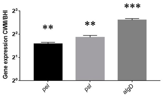 Expression of Pseudomonas aeruginosa PAO1 pel, psl and algD genes after recovering sessile cells in the BioFluxTM system after 72 h of culture. The normalized relative expressions of the studied genes in the CWM were determined for each strain according to the equation 2−∆∆Ct, where ∆∆Ct = (Ctgene − CrpoD) in the CWM-(Ctgene − CtrpoD) in the BHI medium. Results are presented as the mean ± standard deviation of three different experiments. Statistics were performed using a t-test on GraphPad Prism version 7. ** p < 0.01; *** p < 0.001.