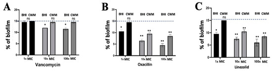 After the constitution of a biofilm with S. aureus Newman, no effect on the reduction of this preformed biofilm was observed using 1x MIC of vancomycin regardless of the medium used (14.7% ± 0.3 in the BHI medium and 15.0% ± 0.1 in the CWM) (p = NS) (Figure 6A). At 10 x and 100x MIC of vancomycin, a significant reduction of the preformed biofilm was shown in the BHI medium (11.9% ± 0.2) (p < 0.1), whereas no effect was noted when the biofilm was constituted in the CWM (14.8% ± 0.1) (p = NS) (Figure 6A). No difference in the percentage of dead bacteria was noted on disrupted biofilm regardless of the concentration of vancomycin used (Table S2). Using oxacillin, a significant reduction in the percentage of preformed biofilm was observed at 1x MIC in the BHI medium (10.8% ± 0.2) (p < 0.1) (Figure 5B). Interestingly, an important reduction of the biofilm was detected using 10 and 100x MIC of oxacillin in both media (in the BHI medium: 7.4% ± 0.3 and 4.7% ± 0.4, respectively; in the CWM: 8.9% ± 0.3 and 8.2% ± 0.3, respectively) (p < 0.01) (Figure 6B). This observation was correlated with a significant increase in the percentage of dead bacteria detected in the two media (p < 0.01) (Table S2). The same observation was noted using linezolid. A reduction of the preformed biofilm at 1x MIC was only shown in the BHI medium (9.8% ± 0.3) (p < 0.1), whereas the decreased percentage of biofilm was more important at 10 and 100x MIC, regardless of the medium used (in the BHI medium: 7.2% ± 0.2 and 6.7% ± 0.3, respectively; in the CWM: 10.6% ± 0.3 and 8.5% ± 0.2, respectively) (p < 0.01) (Figure 6C). We could note that regardless of the antibiotic used and their concentrations, their action on preformed biofilm was significantly reduced in the CWM compared to the BHI medium (p < 0.01).