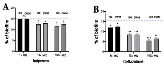 Using P. aeruginosa PAO1, no effect could be noted on the reduction of the preformed biofilm when 1x MIC of imipenem was administrated regardless of the medium used (15.0% ± 0.1 in the BHI medium and 14.9% ± 0.2 in the CWM) (p = NS) (Figure 7A). When the antibiotic concentration was increased (10x MIC and 100x MIC), a significant reduction of the biofilm could be observed with similar results in both media (in the BHI medium: 13.4% ± 0.2 and 12.3% ± 0.2, respectively; in the CWM: 13.7% ± 0.4 and 13% ± 0.3, respectively) (p < 0.01) (Figure 7A). Interestingly, 1x MIC of ceftazidime had a significant impact on the preformed biofilm (12.4% ± 0.2 in the BHI medium and 12.9% ± 0.4 in the CWM) (p < 0.1). This trend was increased at 10x MIC (7.6% ± 0.2 in the BHI medium and 7.7% ± 0.3 in the CWM) and 100x MIC (5.6% ± 0.3 in the BHI medium and 6.4% ± 0.4 in the CWM) regardless of the medium used (p < 0.01) (Figure 7B). We could note that both media had no influence on the antimicrobial action of ceftazidime and imipenem against P. aeruginosa. The percentage of dead bacteria showed significant results at 10x and 100x MIC of ceftazidime (p < 0.01) (Table S2).