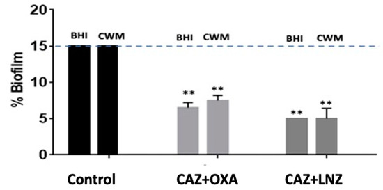 Finally, when an optimized combination of antibiotics (10x MIC of ceftazidime + 10x MIC of oxacillin and 10x MIC of ceftazidime + 10x MIC of linezolid) was used on a preformed biofilm constituted by S. aureus Newman and P. aeruginosa PAO1, a significant reduction of the preformed mixed biofilm was observed in both media when the association of ceftazidime and oxacillin (6.7% ± 0.2 in the BHI medium and 7.1% ± 0.3 in the CWM) and of ceftazidime and linezolid (5.6% ± 0.1 in the BHI medium and 6.2% ±0.7 in the CWM) were used (p < 0.01) (Figure 8). The efficiency of the combination of antibiotics was significantly increased in comparison to the antibiotic used alone on a single species at the same concentration (p < 0.01). This observation was correlated with a significant increase in the percentage of dead bacteria detected when we used these combinations (p < 0.01) (Table S2). As observed with P. aeruginosa alone, the two media had no influence on the antimicrobial action of the combination of antibiotics.