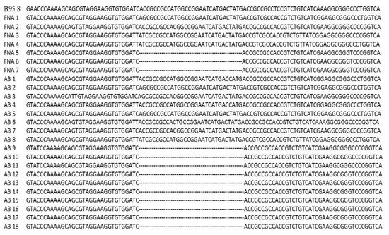 Alignment of reference strain (V01555.2) (first line) with 25 sequences of AB and FNA samples from NPC patients. Dot areas (…………………………) represent the location of 30 bp deletion.