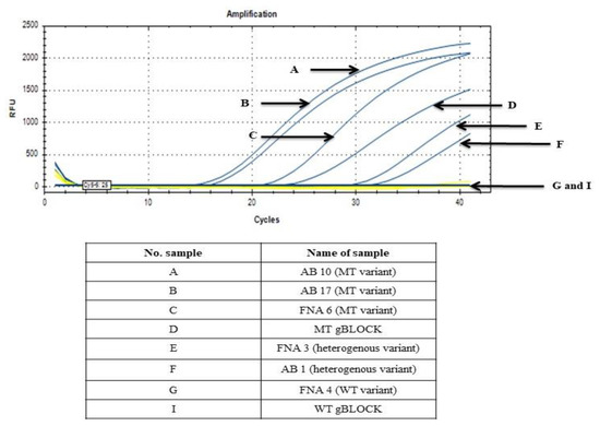 The optimal concentration of target’s probe, primers, MT gBLOCK, WT gBLOCK and IAC synthetic DNA, 400 nM, 500 nM, 20 fg, 20 fg and 60 ag, respectively, were selected in this study. The annealing temperature of 60 °C was chosen as an optimal temperature; this temperature is recommended by Luminaris Probe qPCR Master Mix protocol. A ratio of 40:1 was selected as an optimal ratio of multi-points degenerative blocker:gap-filling mutant primer in this developed assay.