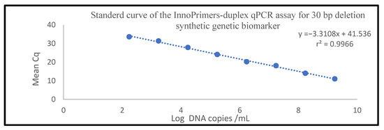 Standard curve of the InnoPrimers-duplex qPCR showing amplification of 10-fold dilutions of 30 bp deletion synthetic DNA NPC genetic biomarker (MT gBLOCK).