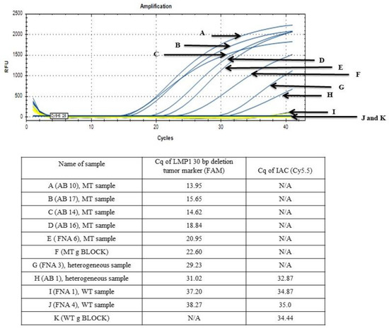 On the other hand, all non-NPC cancer WB samples (n = 36) and healthy WB samples (n = 0/39) were not detected with 30 bp deletion NPC genetic biomarker (Cq ≥ 37), while IAC was amplified in all the tested clinical samples.