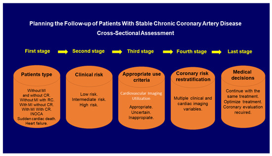 During the follow-up, a cross-sectional assessment is carried out for patients with scCAD. That is, the patient is evaluated at that moment and according to the type of CAD, risk level, appropriate criteria for the practice of an imaging test, prognostic variables, and clinical situation. Medical decisions are taken in relation to their treatment or whether to continue testing to improve the risk re-stratification. Thus, the cross-sectional assessment has five stages (Figure 1) as described below.