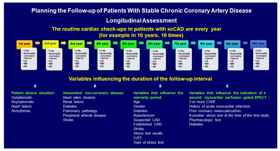 Usually, during the follow-up of patients with csCAD, repeated medical checks are carried out with different intervals. Thus, the number of times we study a patient throughout the natural history of their disease and the follow-up intervals correspond to the longitudinal analysis of the planning (Figure 2). Predicting the number of times a patient with scCAD will be studied at follow-up is impossible. It depends on each particular case, on multiple clinical factors, and the natural development of the disease. Despite this, the clinical situation of the patients, the associated non-coronary diseases, the controversial warranty periods of a test [34] or of myocardial ischemia [35], and the variables that can predict a second test [36] are tools that help to plan the intervals of follow-up of these patients (Figure 2).