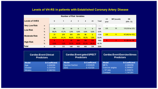 There are multiple algorithms, nomograms, or scores to stratify coronary risk [16,17,18,19,26,27], that have as an objective the calculation of the probability of cardiac death, non-fatal MI, heart failure, stroke, and CR. However, most of them are for patients who do not have previous stable CAD, or analyze the risk without differentiating between patients with established or suspected CAD [26], or are algorithms that do not use an imaging test [16,17,18,19]. Regardless of this, all these studies have their practical application at some point in patient follow-up. The purpose of this review was about planning the assessment of risk in patients with an scEAC, therefore, it requires algorithms, nomograms, or scores validated for patients with previously diagnosed CAD. One of the few extensive studies with 6441 patients recently published to stratify coronary risk is the VH-RS [28]. The Vall d’Hebron Risk Score (VH-RS) method has several particularly useful features: it focuses on patients with different clinical variables, who underwent exercise tests, and myocardial perfusion gated SPECT images, and it assesses an individual’s cardiac risk for non-fatal MI, CR, and/or cardiac death in patients with established CAD or patients with suspected CAD. This new risk score allows the risk to be calculated for individual patients with a mean of a 4-year follow-up. The importance of dividing the population into patients with established CAD or patients with suspected CAD lies in the fact that the patients with established CAD have a significantly higher prevalence of cardiac complications or advanced CAD. The VH-RS allows the stratification of patients into four risk levels: very low risk, low risk, moderate risk, and high risk (Figure 3).