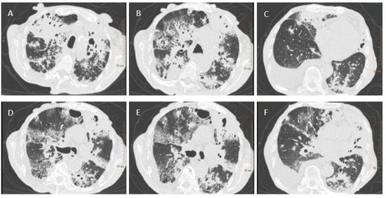 Figure 1. Chest CT scans. (A)—parenchymal-atelectatic lesions; thick-walled cavities filled with masses of tissue decay in the upper lobes; (B)—parenchymal-atelectatic lesions; cavities filled with tissue decay in segment 3 of the right and left lung, with the accompanying areas of tree-in-bud-appearance in segment 3 of the left lung and in the apex of segment 6 of the right and left lung; (C)—fluid in the pleural cavity; (D–F)—tree-in-bud-appearance in the apex of segment 6 of the right lung and in segments 6–9 of the left lung.
