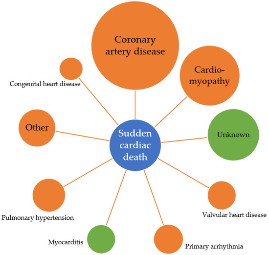 The World Health Organisation defines SCD as a natural and unexpected death of cardiac cause within 1 h of the symptom onset or within 24 h of a person being last seen alive and well, in the case of an unwitnessed death [16]. Sudden cardiac arrest or SCD is the first presentation of cardiac disease in 50% of cases [17] and survival is low, with only 10% of patients with sudden cardiac arrest surviving to hospital discharge [18]. SCD accounts for almost half of all deaths from cardiovascular disease, with the largest proportion of SCD the result of ischaemic heart disease (IHD) [19,20]. Differences exist in the causes of SCD across the lifespan, with myocarditis and unexplained death more commonly observed in young populations, compared to coronary artery disease being the predominant cause in individuals over the age of 50 (see Figure 1) [21,22]. Importantly, individual risk prediction remains poor with most individuals who experience SCD not being identified as high risk prior to their arrest [20,23,24].