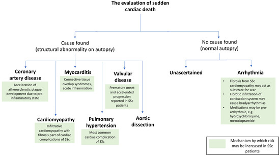 Potential mechanisms of sudden cardiac death in systemic sclerosis. Abbreviations: SSc: systemic sclerosis.