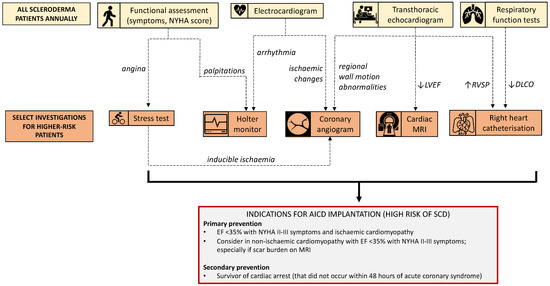 Rhythm abnormalities are treated empirically in SSc, with an absence of robust evidence-base for disease-specific treatments. Progressive cardiac disease is observed despite treatment with vasoactive, heart failure and anti-arrhythmic therapies. There are rare reports of successful treatment of sustained ventricular tachycardia with catheter ablation [73,74,75,76] and case series of successful ICD insertion with appropriate discharge and prevention of potential sudden cardiac arrest [77,78,79,80]. However, there are no SSc-specific guidelines for primary prevention of SCD in SSc with ICD.