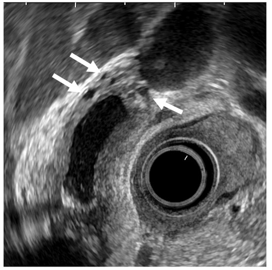 - Mizuguchi, M.; Kudo, S.; Fukahori, T.; Matsuo, Y.; Miyazaki, K.; Tokunaga, O.; Koyama, T.; Fujimoto, K. Endoscopic ultrasonography for demonstrating loss of multiple-layer pattern of the thickened gallbladder wall in the preoperative diagnosis of gallbladder cancer. Eur. Radiol. 1997, 7, 1323–1327. [Google Scholar] [CrossRef] [PubMed]