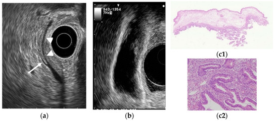 GB carcinoma is associated with pancreaticobiliary maljunction without biliary dilatation. (a) EUS shows the bile duct (arrowhead) and main pancreatic duct (arrow) communicated inside the pancreas. (b) EUS shows the irregular GB wall-thickening on fundus without wall layer structure disruption. (c1,c2) H–E stain of the specimen demonstrates adenocarcinoma with tumor in situ stage.