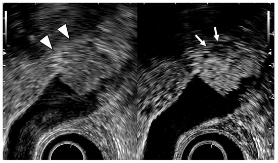Several studies have evaluated EUS in the differential diagnosis of GB protuberant lesions [22,23,24,25,26,27,28,29]. The differential diagnosis for neoplastic and non-neoplastic lesions is based on size, number, morphology, surface contour, internal echotexture, and internal structure (Table 3). Among these findings, classifying them into pedunculated or sessile (broad-based) types is very important. Most pedunculated lesions are benign, and cholesterol polyps are the most common. Multiple polyps measuring ≤10 mm are highly likely to be cholesterol polyps [30]. However, malignant tumors are included in rare cases. These lesions are frequently incidental findings during abdominal examinations, and precisely distinguishing benign lesions from malignancies is important. EUS can visualize the layered structure of the GB and provide high-resolution images using high ultrasound frequencies. The characteristic findings of cholesterol polyps on EUS are a deeply notched granular surface and morular morphology. The internal echo is rough or granular, and highly echogenic punctiform foci reflecting cholesterolosis are visible (Figure 1) [25]. Peduncles are thin. Thus, they are often unobserved even on EUS [26]. Akatsu et al. [27] described the presence of hyperechoic spots, and multiple microcysts were important indicators of non-neoplastic lesions. Kimura et al. [24] described a granular contour, and a spotty internal echo pattern in the pedunculated polypoid lesions indicated benign pathology.