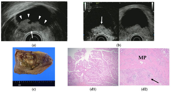 GB carcinoma. (a) Conventional EUS shows elevated lesions with conspicuous surface irregularities (arrowheads) observed in the gallbladder body. A hypoechoic region is observed in the deep part of the lesion (arrow), and the outer hyperechoic layer is also irregular, suggesting infiltration into the subserosal layer. (b) The contrast-enhanced harmonic EUS image after the injection of Sonazoid® shows that lesions in the gallbladder body (arrow) have a strong heterogeneous staining effect from the early stage of contrast enhancement. (Left contrast-enhanced harmonic mode, right B-mode) (c) Photograph of the gross pathologic specimen after cholecystectomy shows that the papillary neoplasm with a maximum diameter of 55 mm is found from the body to the bottom of the gallbladder. (d1,d2): H-E stain of the specimen demonstrates atypical epithelial cells grow papillary. Infiltration into the subserosal layer is observed in a part of the deep part of the tumor with infiltration and hyperplasia of poorly differentiated adenocarcinoma. (MP muscularis propria).