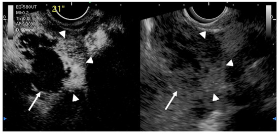 - Tamura, T.; Yamashita, Y.; Itonaga, M.; Ashida, R.; Kitano, M. Usefulness of EUS-FNA with contrast-enhanced harmonic imaging for diagnosis of gallbladder tumor. Endosc. Ultrasound. 2021, 10, 224–226. [Google Scholar] [CrossRef]