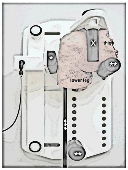 Experimental setup to image the functionality of the posterior cruciate ligament in human knee joint specimens. The specimen was laterally positioned in 90° of flexion. The thigh was fixed in a knee-holding apparatus (X) to prevent displacement under loading. Padded pressure applicator below the tibial tuberosity (*), padded abutments as counter-bearings (**), and polyvinyl-chloride rod in the medullary cavity of the tibia (***). Sketched visualization of the specimen-loaded device. Same right knee joint specimen as in Figure 2 and Figure 4.