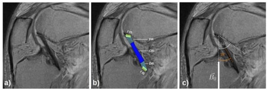 Exemplary visualization of the osseous and ligamentous regions-of-interest of the posterior cruciate ligament (PCL) and the orientation of the PCL to the main magnetic field B0. On the corresponding morphologic parasagittal image with moderate T2-weighting (echo time = 41.4 ms) (a), the PCL was identified and manually segmented. The PCL’s segmentation outline was automatically divided into quarters for further subregional analysis (b). The proximal 25% of the PCL was defined as the proximal subregion (PR, light blue), the central 50% as the central subregion (CR, blue), and the distal 25% as the distal subregion (DR, light blue). The femoral (fIS) and tibial insertion sites (tIS) of the PCL were positioned around the cortical bone of the respective insertion sites and are outlined by rectangular boxes (yellow). The white arrow indicates the orientation of the main magnetic field B0 (c). The orange dashed lines indicates the principal orientation of the PCL and an angle of 28° (orange) was determined between the PCL and the main magnetic field. Similarly, the orientation of the magic angle of 55° with respect to B0 is indicated by the white dashed lines. Same right knee joint specimen as in Figure 1 and Figure 4 (δ1-configuration).