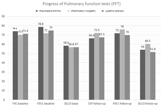 As shown in Table 3, mean PFT values worsened at the end of follow-up compared with baseline. By subgroup, FVC, FEV1, and DLCO decreased significantly at the end of follow-up in patients with RA, as did FVC and DLCO in patients with SS (Figure 2). Furthermore, as seen in the table, no significant differences in PFT values at diagnosis were recorded between the subgroups. However, at the end of follow-up, FVC and DLCO values were lower in patients with RA and SS than in those with IM (p = 0.036 and p = 0.026, respectively).