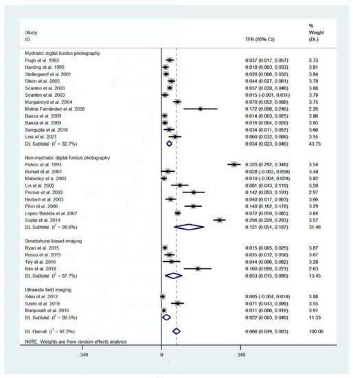Several of the analyzed studies are more than 10 years old, and one must consider that in recent years there has been a technical development in fundus cameras. First, advancements in the field of optical sources and detectors have led to miniaturization of optical assemblies at a lower cost. In line with these developments, miniature table-top fundus camera system designs have emerged that provide retinal images comparable to those of traditional fundus cameras [103].Camera systems have evolved to boast sharper images, having a higher resolution, pupil tracking, and, most recently, portability. Potentially, an improvement in camera optics could result in decreasing the TFR rate. On the other hand, this has not been proved in clinical trials.