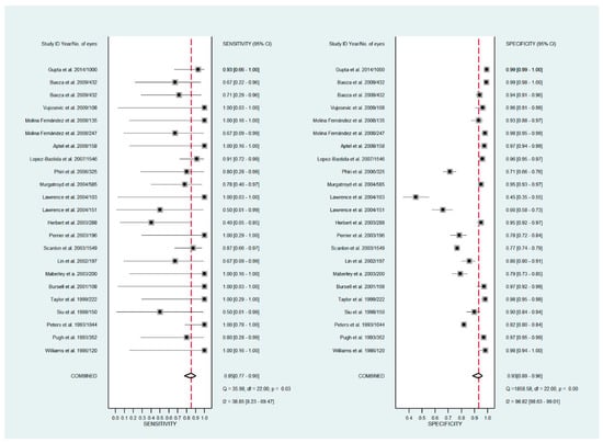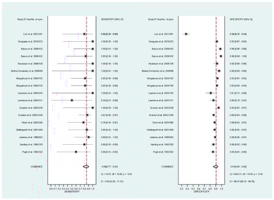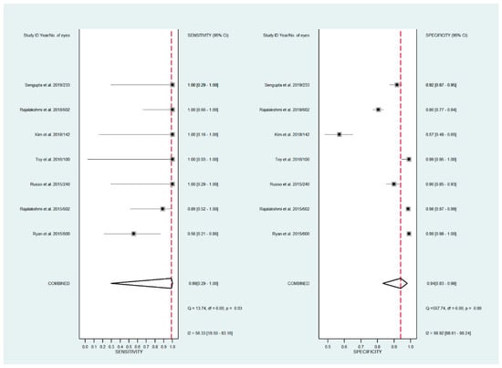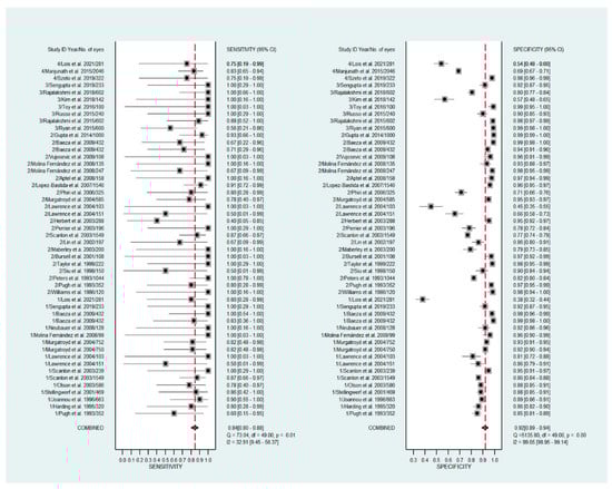 Forest plots for the sensitivity and specificity of mydriatic fundus photography.