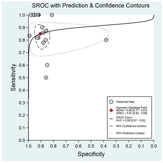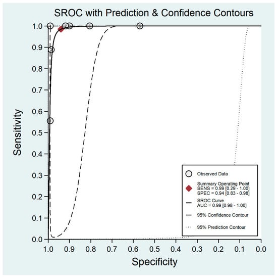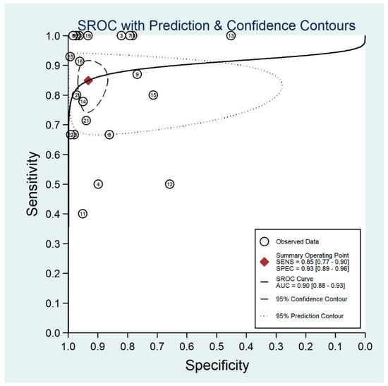The pooled specificity for all methods was 0.92 (95% CI: 0.89–0.94) (Figure 2). The specificity of mydriatic fundus photography (0.91 [95% CI: 0.84–0.94], I2 = 98.47) was not different from that of non-mydriatic fundus photography (0.93 [95% CI: 0.89–0.96], I2 = 98.82). The pooled specificity of smartphone-based imaging studies (0.94 [95% CI: 0.83–0.98], I2 = 98.92) was significantly better than that of mydriatic (p < 0.001) and non-mydriatic fundus photography (p < 0.001). There was no difference observed in the specificity for mydriatic and non-mydriatic photography (p > 0.05). The receiver operating characteristic (ROC) curves of the analyzed methods are shown in Figure 6, Figure 7 and Figure 8.