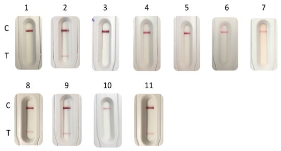 NG-Test VanB results obtained with 1-µL loop full of E. faecium VanB grown on different agar plates: (1) Müller–Hinton (MH); (2) MH with a 5-µg vancomycin disk; (3) Chocolate agar PolyViteX; (4) Columbia Agar + 5% horse blood; (5) UriSelect4; (6) Bile esculin agar; (7) D-Coccosel agar; (8) ChromID®VRE; (9) MH supplemented with 6 mg/L of vancomycin; and with 500 µL of overnight grown E. faecium VanB (10) in brain heart infusion (BHI); (11) and in BHI with a 30-µg disk of vancomycin. For 10 and 11, spun down bacterial pellets were resuspended in 100 µL of EB-80 and incubated for 5 min at RT prior to loading on the cassette. C stands for control line and T for test line.